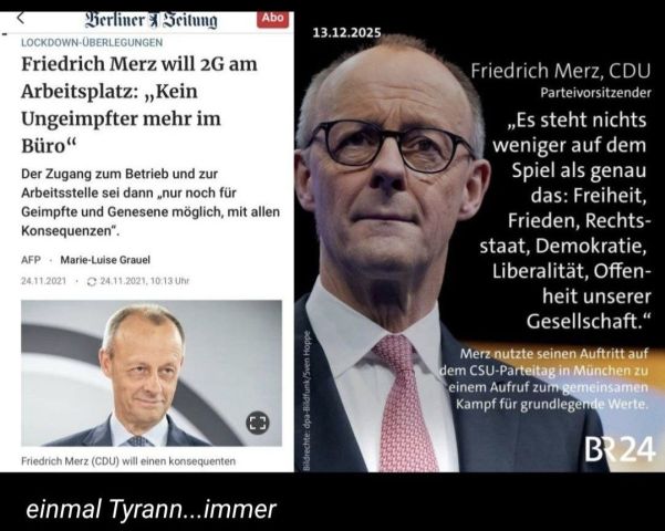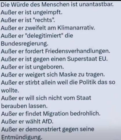 Wir fordern ein Gesetz einzuführen, nachdem Politiker ihr Amt und ihre Bezüge verlieren können, wenn sie absichtlich lügen. Sie sollen auch für falsche Entscheidungen künftig haften, auch die Beamten und Mitarbeiter in den Behörden. Hintergrund ist das sinkende Vertrauen der Bevölkerung in die Politik und in die Behörden. Es ist allarmierend, dass ein Spahn bis zum Hals im Sumpf steckt und dennoch unangefochten bleibt. Entweder schützt ihn ein kriminelles, korruptes System, oder er schützt sich selbst – auf Kosten der Allgemeinheit. Beides ist für eine angebliche Demokratie sehr beunruhigend. Deutschland braucht eine Trump Allianz, mit Putins Unterstützung! Freiheit beginnt mit NEIN! – Totalitär ist es dort, wo das Nein eines anderen Menschen übergangen wird. Kein Platz mehr für Mensch und Tier! Wälder werden vorsätzlich für Windräder und Solarparks abgeholzt, die Meeresfauna wird vorsätzlich für Windparks-Offshore zerstört. Wie kann es sein, dass ein Land, dass mit einer Bevölkerung von nur 80 Millionen zu den größten 5 Volkswirtschaften der Welt gehört, sich weder eine ordentliche, lebenserhaltende Rente, noch ein funktionierendes Bahnnetz, noch irgendetwas anderes leisten kann, wo geht also das Geld hin, Herr BlackRock-Kanzler-Merz, Herr Klingbeil, Herr Kriegstreiber-Pistorius?