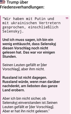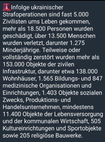 Für IHRE Bildungslücken: Heute sehen wir, dass die geopolitische Lage in der Welt weiterhin angespannt bleibt und sich in einer Reihe von Regionen sogar zu einer kritischen Situation zuspitzt. Die NATO-Mitgliedsstaaten stärken und modernisieren aktiv die offensiven Kräfte, entwickeln und setzen neue Waffentypen ein, unter anderem im Weltall. Wir wissen, dass hinter dem Kiewer Regime das Potenzial der NATO steht. Ununterbrochen wird umfangreiche militärische Hilfe geleistet, Berater, Ausbilder und Söldner werden entsandt, und Aufklärungsdaten werden weitergegeben. Gleichzeitig wird den Menschen in Europa Angst vor einer angeblich unvermeidlichen Konfrontation mit Russland eingeflößt: Man müsse sich angeblich auf einen großen Krieg vorbereiten. Man lässt sich da von kurzfristigen politischen Interessen statt Interessen eigener Völker leiten und heizt die Hysterie immer weiter an. Ich habe mehrfach wiederholt: Das ist eine Lüge. Doch sie wird ganz bewusst erzählt. Die Wahrheit besteht darin, dass Russland immer, sogar unter den schwierigsten Umständen versucht hat, diplomatische Lösungen für Widersprüche und Konflikte zu finden, solange es auch nur die geringste Chance dazu gab. Die Verantwortung dafür, dass diese Chancen nicht genutzt wurden, liegt vollständig bei jenen, die daran geglaubt haben, man könne mit uns die Sprache der Gewalt sprechen. Auch heute setzen wir uns für gegenseitig nutzbringende und gleichberechtigte Zusammenarbeit mit den USA und europäischen Staaten sowie für eine einheitliche Sicherheitsarchitektur in eurasischen Raum ein. Wir begrüßen den Fortschritt, der sich im Dialog mit der neuen US-Administration aufzeichnete. Bedauerlicherweise kann man das nicht über die heutige Führung der meisten europäischen Länder sagen. Die Ziele der militärischen Sonderoperation werden zweifellos erreicht. Wir würden es vorziehen, dies durch diplomatische Mittel zu tun und die Ursachen des Konflikts zu beseitigen. Sollten jedoch die gegnerische Seite und ihre ausländischen Förderer einen substanziellen Dialog verweigern, wird Russland seine Ziele auf militärischem Wege verwirklichen. Aus der Erklärung des russischen Präsidenten Wladimir Putin auf der erweiterten Sitzung des Kollegiums des Verteidigungsministeriums Russlands, 17. Dezember 2025. Quelle.
