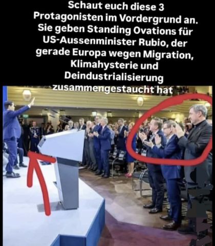 US-AUSSENMINISTER MARCO RUBIO MIT KLARTEXT AUF DER MÜNCHNER SICHERHEITSKONFERENZ: Um einen Klimakult zu besänftigen, haben wir uns selbst Energiepolitiken auferlegt, die unsere Bevölkerung verarmen lassen – während unsere Wettbewerber Öl, Kohle, Erdgas und alles andere ausbeuten, nicht nur zur Versorgung ihrer eigenen Volkswirtschaften, sondern auch als Druckmittel gegen uns. Und im Streben nach einer Welt ohne Grenzen haben wir unsere Türen für eine beispiellose Welle massenhafter Migration geöffnet, die den Zusammenhalt unserer Gesellschaften, die Kontinuität unserer Kultur und die Zukunft unserer Völker bedroht. Diese Fehler haben wir gemeinsam begangen – und nun schulden wir es unseren Bürgern, diesen Tatsachen ins Auge zu sehen und gemeinsam voranzugehen. Kommentar: Leider leben wir in der EU – und damit, so scheint es, in der Geiselhaft der Woken, der Kriegstreiber und der Klimadiktatoren: in einem politischen Raum, in dem Männer in Frauenkleidern Kinder bekommen können, die Luft besteuert wird – und zwar in einem Ausmaß, das Wirtschaft und Industrie stranguliert – und in dem unser Lebensraum schleichend vom Islam kolonisiert wird. So bleibt uns nur der neidvolle Blick auf ein Land, das offenbar gerade noch rechtzeitig die Kurve bekommen hat, weil dort Politiker an die Macht gewählt wurden, die noch alle Tassen im Schran haben. Quelle.