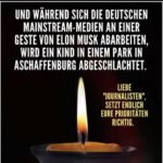 Deutschland Kurier: Sind Baerbock, Söder, Scholz und Faeser jetzt endlich begeistert? Sie haften alle nach internationalem Recht persönlich, weil Sie alle Warnungen ignorierten und den Tod anderer Menschen billigend in Kauf nehmen. Messer-Terror in Aschaffenburg. Afghane ersticht Kleinkind und Mann in Park. Neuer Horror-Angriff im Söder CSU-regierten Bayern. Ein Messerstecher überfällt am hellichten Tag eine Kita-Gruppe in einem Park der unterfränkischen Stadt Aschaffenburg, tötet einen zweijährigen Jungen und einen 41jährigen Mann und verletzte ein weiteres Kind schwer. Als Tatverdächtiger wurde ein 28jähriger Afghane festgenommen. Der Täter hatte die Gruppe aus fünf Kita-Kindern und ihren Erzieherinnen gegen Mittag im Park Schöntal verfolgt. Als die Erzieherinnen die Kinder in Sicherheit bringen wollten, griff der Afghane die Kinder gezielt mit einem Messer an, tötete den Zweijährigen und verletzte ein weiteres Kind schwer. Es wurde im Klinikum Aschaffenburg operiert. Der 41jährige Mann opferte sein Leben, als er sich schützend vor eines der Kinder stellte. Polizisten nahmen den afghanischen Tatverdächtigen in unmittelbarer Nähe des Tatorts fest. Eine Erzieherin und mehrere traumatisierte Polizeibeamte sind in psychologischer Betreuung. Der neun Hektar große historische Park Schöntal liegt in der Nähe der Aschaffenburger Innenstadt und wurde erst im November 2024 wegen einer Messerstecherei und zunehmender Raub- und Drogendelikte in Teilen als „gefährlicher Ort“ eingestuft. Trotzdem hatte Polizeichef Frank Eckhardt den Aufenthalt im Park zuletzt als „objektiv sicher“ bezeichnet. Im Mai 2024 hatte eine Polizeistreife in Aschaffenburg den Messerangriff eines Syrers auf einen Kindergarten verhindert. Erst am Wochenende war in Wolfenbüttel der neunjährige André zu Grabe getragen worden, der beim Terroranschlag eines Arabers auf den Magdeburger Weihnachtsmarkt am letzten Adventswochenende ermordet worden war.