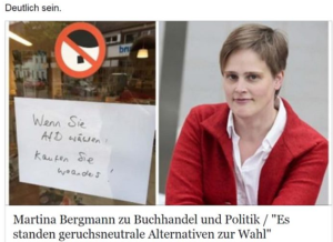 Auch das ist Deutschland: „Wenn Sie AfD wählen: Kaufen Sie woanders!“ Menschen werden ungeniert bedroht und die Polizei schaut schon wieder weg? Kennen wir das nicht schon aus Hitlers (SA) und aus (Stasi) Zeiten? „Deutlich sein“. So nennt Martina Bergmann es, wenn sie am Wahlabend ein Blatt Papier in das Schaufenster ihres Buchlandes hängt auf dem zu lesen ist „Wenn Sie AfD wählen: Kaufen Sie woanders! Die Buchverlegerin fand zudem, dass „geruchsneutrale Alternativen zur Wahl gestanden hätten“. Das Börsenblatt, die Hauszeitschrift des Deutschen Buchhandels, druckt offensichtlich mit größter Freude den verbalen Auswurf der Kleinverlegerin ab. Viele Menschen in Deutschland haben das Gefühl, wenn sie das Haus verlassen betreten sie Feindesland. Winston Churchill sagte einmal: „Die DEUTSCHEN sind ein Voklk, entweder küssen sie dir die Füße oder sie hängen dir am Hals und du wirst sie nie wieder los“, genauso ist es derzeit, Die UN bestätigte uns im Gespräch, dass die Weltgemeinschaft die Nase von Deutschland voll hat! Die Steuergier in Deutschland vetreibt viele aus dem Land. Finanzämter und Politiker sind für die zunehmende Armut und Insolvenzen verantwortlich. Das BKA vertuscht 600 00 Straftaten allein von Flüchtlingen