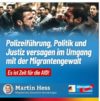 Wir geben dem Volk wieder eine Stimme: 1. „Die Migrantensache haben wir vor allem Merkel zu verdanken, die sie in Massen und ohne Kontrollen ins Land bat und ließ. Dafür sollte sie eigentlich im Knast hocken statt in ihrer Villa mit eine fetten Pension und noch eine Ehrung um die andere – frage mich für was die Ehrungen?“ 2. „Auf welcher Seite tickt unsere Polizei eigentlich? Werden Sie auch von oben für Unrecht gesponsert? Die Bürger fühlen sich nicht mehr geschützt sondern ausgeliefert. Dass wir so einen Migrantenhaufen im Land haben, die sich zum großen Teil wie eine Horde wild gewordener Affen verhalten und in der deutschen Bevölkerung Unsicherheit und Angst auslöst haben wir vor allem den den Grünen, vorne dran der Faeser zu verdanken. (….)“. 3. „Die Polizei steht zwischen dem gemeinen Volk und der Regierung, ich frage mich, warum die sich von den Regierungshanseln dreinquatschen lassen? Eigentlich ist doch alles gesetzlich geregelt, aber von der Politik werden einfach die Gesetze und Regelungen willkürlich ausgehebelt. Die Polizei sollte vielleicht mal bei den momentanen Regierungshanseln anfangen, Handschellen klicken zu lassen. Angefangen beim Kanzler und der Innenministerin Nanci Faeser!“ 4. „Sarazin hat ganz einfach, RECHT! Deutschland schafft sich ab. Nur gut, ich bin schon 77! Es lebe die AfD! Und die regierenden sind selber Schuld, das man der AfD Glauben schenkt. Die Hetze gegen sie bringt nichts, das gemeine Volk sieht was hier los ist.“ 5. „Da eröffnet sich dem Leser/Zuschauer ein weiterer Einblick, was in den vergangenen Jahren tatsächlich alles falsch gemacht wurde, sei es eine Verkehrs-, Agrar- oder Energiewende die uns vorschreiben will wie wir zu leben haben, die Digitalisierung des Landes zur Überwachung der Bürger, die Schaffung neuen Wohnraums ausschliesslich für Migration, die Investitionen in Infrastruktur wurden weitgehend eingestellt und vor allem die unsinnige Maßnahmen zum Klimaschutz.“ 6. „Ach Polizei, was seit ihr nur für Helden. Auf der einen Seite müsst ihr euch die Fresse von den Leuten polieren lassen, die ihr auf der anderen Seite schützt. Ich weiß ihr habt einen schweren Stand, angesichts einer Dienstherrin, die auf Demos geht, wo zur Gewalt gegen euch aufgerufen wird, aber ihr seit keine Knechte oder Sklaven mit denen man alles tun kann. Ihr habt genauso eine Wählerstimme wie jeder hier in Deutschland. NOCH. Übrigens, glaubt ihr wirklich ein solches Verbot durchsetzen zu können?“