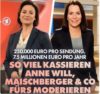 Wie uns die Staats-Medien schamlos abzocken: Wer sich alles an uns bereichert und sich die Taschen vollstopft. Glauben sie, Frau Maischberger, dass 250.000 Euro aus Zwangsgebühren wirklich angemessen sind, für das was sie uns bieten? 250.000 Euro pro Sendung, 7,5 Millionen Euro pro Jahr. So viel kassieren Anne Will, Maischberger & Co. fürs Moderieren. Großverdienerinnen des öffentlich-rechtlichen Rundfunks: Sandra Maischberger und Anne Will. Da Anne will, Frank Plasberg und Sandra Maischberger eigene Produktionsfirmen besitzen, kassieren sie teilweise sogar doppelt. Anne Will – 4100 Euro pro Minute. Am meisten zahlte die ARD den Berechnungen des Business Insider zufolge für „Anne Will“. Die Talkmasterin erhielt rund 250.000 Euro pro Sendung und damit rund 7,5 Millionen Euro pro Jahr. 4100 Euro kostete die Sendeminute. Produziert wird der Talk von Wills eigener Produktionsfirma, der Bilanzgewinn betrug 2021 rund 1,2 Mio. Euro.