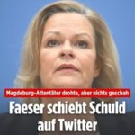 Die linkextreme Nancy Faeser: Sie erklärt auch nach dem erneuten Terroranschlag von Magdeburg auf unschuldige Besucher des dortigen Weihnachtsmartes – Weihnachtsmärkte dennoch als weitgehend sicher. Zu den Feststellungen das der Terror – Attentäter polizeilich und behördlich bekannt war, und selbst die Saudi – Arabische Regierung vor ihm gewarnt hat, äussert sie sich wie immer in schlangenwindender Manier. Das dieser Terroranschlag auf komplettes Versagen aller deutschen Behörden zurück zu führen ist, wofür sie selbst als Innenministerin und extremistischen Verfechterin deutscher komplett illegaler Migrationspolitik die Hauptverantwortung trägt, blendet sie zu ihrem Eigenschutz und um sich aus ihrer politischen Verantwortung hierfür heraus zu stehlen, natürlich voll und ganz aus. Schaut hierzu und zu der gesamten komplett illegalen BRD Migrationspolitik bitte auch hier und ganz besonders – zum erleuchtenden Aha Erlebnis – in den dortigen Links! FAZIT: Auch dieser Terroranschlag hätte durch konsequente Abschiebung und der rechtzeitigen Auslieferung des Irren Attentäters verhindert werden können. Woran Nancy Faeser, -und ihre deutschen Behörden – offensichtlich gar kein Interesse haben! Was sagt Euch das? Wem und welchen Zielen dient Nancy Faeser und ihre Behörden? – Ganz gewiss nicht den Deutschen und den Interessen der Deutschen! Deshalb haftet nach internationalem Recht auch Faeser persönlich für diese Tat.