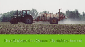 Die Krebsforschungsagentur (IARC) der Weltgesundheitsorganisation hat das weltweit meistgenutzte Pestizid als wahrscheinlich krebserregend eingestuft: Glyphosat. Dennoch droht das vom Agrochemiekonzern Monsanto entwickelte Totalherbizid in der Europäischen Union weiterhin zugelassen zu bleiben. Der EU-Ministerrat entscheidet darüber womöglich schon Mittwoch oder Donnerstag. Daher müssen wir jetzt unsere Regierung in die Pflicht nehmen: Fordern Sie Bundeslandwirtschaftsminister Christian Schmidt (CSU) auf, die Wiederzulassung von Glyphosat zu stoppen.