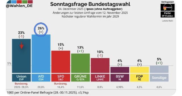 Mehrheit kann sich vorstellen, AfD zu wählen: Die AfD ist längst Volkspartei. Mehr als die Hälfte der Deutschen kann sich vorstellen, die AfD zu wählen. Während die SPD, die Grünen, die Linke und Teile der Union noch über die Brandmauer diskutieren, ist selbige bei den Bürgern längst gefallen. Laut der jüngsten INSA-Umfrage liegt die AfD nicht nur bei 26 Prozent, insgesamt können sich rund 51 Prozent der Bürger vorstellen, unter Umständen die AfD zu wählen. Außerdem hat die AfD das größte feste Wählerpotenzial, also Bürger, die ziemlich sicher hinter der AfD stehen. Damit ist die Alternative für Deutschland längst zur Volkspartei avanciert. Und sie hat von der SPD die Rolle der Arbeiterpartei übernommen, während die linken Parteien sich auf links eingeschworene Teile des ideologisch indoktrinierten Akademiker-Milieus stützen, fernab der Belange und Sorgen einfacher Bürger, die tagtäglich zur Arbeit gehen müssen. Je mehr die wirtschaftliche Schieflage Deutschlands unter der Merz-Klingbeil-Koalition sichtbar und fühlbar wird, desto mehr Bürger wenden sich von der Union und SPD ab und suchen die einzig realistische Alternative. Die Mainstream-Medien und der Öffentlich-Rechtliche Rundfunk versuchen sich gegen diesen Trend mit ihrer Propaganda-Offensive zu stemmen. Doch immer mehr Bürger verlieren das Vertrauen in die etablierten Medien und wenden sich den alternativen Medien zu, weil diese den Mut zur Wahrheit haben. Für diesen Mut zur Wahrheit steht nicht nur die „Freie Welt“. Wir von der RRRedaktion kämpfen Tag für Tag gegen die Narrative und Propaganda der Mainstream-Medien an, um ihnen das Monopol auf die Deutungshoheit zu entziehen. Weiterlesen, hier und hier.