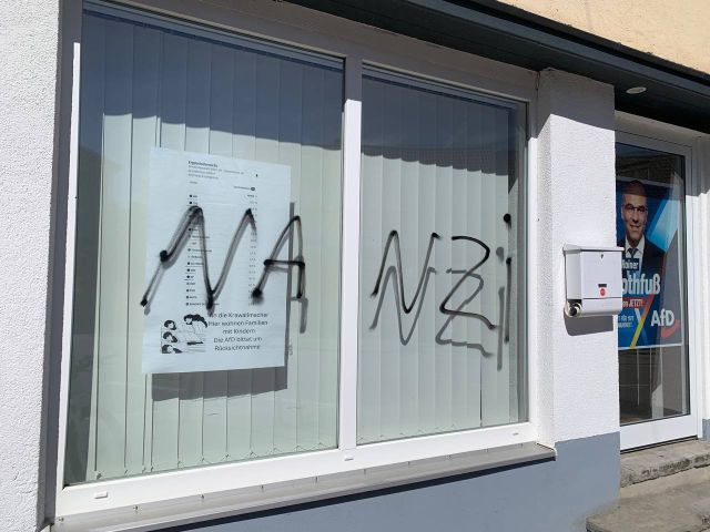 Wahlkreisbüro in Kempten: Kann mir jemand sagen, was ein „NANZI“ ist? Sehr nett, dass nur die Scheibe angesprüht wurde von den selbsterklärten „Demokratierettern“, nachdem in den Wochen zuvor der Briefkasten aufgebrochen, Hundefäkalien an die Scheibe geschmiert und Sekundenkleber ins Schlüsselloch gespritzt worden waren… Dietrich Bonhoeffer: „Dummheit ist ein gefährlicherer Feind des Guten als Bosheit.“ Und was macht die politisierte Staatspolizei? Sie schaut natürlich weg?