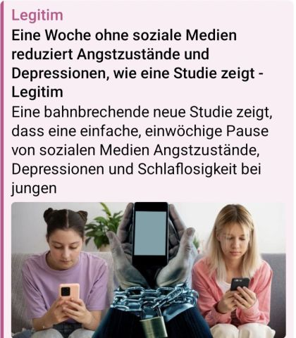 Die Jugend wurde bereits vorsätzlich krank und süchtig gemacht: So will es die Politik. Die Studie: Eine Woche ohne soziale Medien reduziert angeblich Angstzustände und Depressionen. Eine bahnbrechende neue Studie zeigt, dass eine einfache, einwöchige Pause von sozialen Medien Angstzustände, Depressionen und Schlaflosigkeit bei jungen Erwachsenen erheblich reduzieren kann. Die Studie, an der fast 300 Freiwillige teilnahmen, liefert einige der bislang überzeugendsten Belege dafür, dass das Problem nicht unbedingt die Bildschirmzeit an sich ist, sondern die schädlichen Nutzungsmuster, die durch bestimmte Plattformen gefördert werden. Fakt ist: Es soll nur die überlasteten Psychiater entlasten. Von der Mobilfunk-Sucht = Handysucht ist nicht die Rede, auch nicht über die Traumatisierung durch die Corona-Lügen. Erst macht man die Jugend süchtig und krank, dann kommt ein neues Geschäftsmodell. Weiterlesen.
