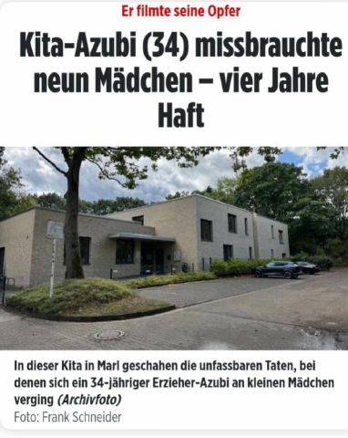 Schützt eure Kinder, schützt sie mit allen Mitteln: Pädophilen-Gender-Regenbogen-Land Deutschland, die Altparteien und die Kirchen sind begeistert? Nach einer Missbrauchs-Serie in einem Kindergarten in Marl im Kreis Recklinghausen ist ein angehender Erzieher am Donnerstag zu vier Jahren Haft verurteilt worden. Der 34 Jahre alte Angeklagte hat gestanden, zwischen Dezember 2024 und Mai 2025 insgesamt neun Mädchen missbraucht und dabei zum Teil auch gefilmt zu haben. Die Taten waren bekanntgeworden, nachdem eine Mutter an ihrer Tochter auffällig sexualisiertes Verhalten beobachtet hatte. Die sexuellen Übergriffe passierten im Außenbereich der Kita, im Ruheraum und auf der Toilette. Dort sind auch Nacktaufnahmen von einer Dreijährigen entstanden. Die Kinder leiden laut Urteil noch immer unter den Folgen. Mehrere Mütter hatten vor Gericht von Schlafstörungen und erneutem Bettnässen berichtet. Das Urteil ist noch nicht rechtskräftig. Ich will nicht wissen was noch so alles in den LGBTQ Kita’s so passiert.