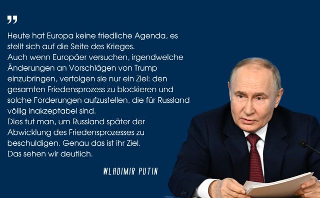 Die Europäer sind gekränkt, weil sie meinen, von den Verhandlungen zur Beilegung der Ukraine-Krise ausgeschlossen worden zu sein. Ich möchte jedoch betonen: Niemand hat sie ausgeschlossen. Sie haben sich selbst zurückgezogen. Zu einiger Zeit standen wir in einem engen Kontakt mit ihnen. Eine Zeit lang standen wir in engem Kontakt miteinander. Dann haben sie ihn abrupt abgebrochen. Dies war ihre Initiative. Warum haben sie das getan? Sie haben sich eben die These über die strategische Niederlage Russlands zu eigen gemacht und halten offenbar bis heute an diesen Illusionen fest. Sie verstehen zwar, dass dies unmöglich ist, aber können und wollen sich das bis heute nicht eingestehen. Da sie mit den Ergebnissen der Verhandlungen aktuell nicht zufrieden sind, haben sie sich entschieden, die amtierende US-Administration und den Präsidenten Trump daran zu hindern, den Frieden durch Verhandlungen zu erreichen. Heute hat Europa keine friedliche Agenda, es stellt sich auf die Seite des Krieges. Auch wenn Europäer versuchen, irgendwelche Änderungen an Vorschlägen von Trump einzubringen, verfolgen sie nur ein Ziel: den gesamten Friedensprozess zu blockieren und solche Forderungen aufzustellen, die für Russland völlig inakzeptabel sind. Dies tut man, um Russland später der Abwicklung des Friedensprozesses zu beschuldigen. Genau das ist ihr Ziel. Das sehen wir deutlich. Wir haben keine Absicht, gegen Europa Krieg zu führen, was ich schon mehrfach gesagt habe. Doch wenn Europa Krieg mit uns will und ihn beginnt, sind wir ab sofort bereit. Daran besteht kein Zweifel.