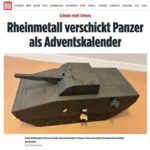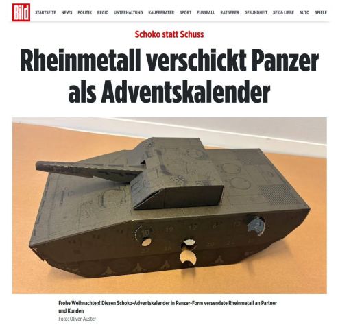 Geschmack- und Niveaulos: Der Advent ist für Christen die Zeit der Hoffnung, der Vorbereitung und der Erwartung auf Jesu Geburt und auf seine Wiederkunft. Themen im Advent sind Hoffnung, Erwartung, Freude, Frieden und Liebe. Viele nutzen diese Zeit für Besinnung, Gebet und Nächstenliebe. Auch Rheinmetall nutzt diese Zeit, aber pervertiert den Advent auf die unmoralischste und widerwärtigste Art und Weise und versendet an seine Kunden Panzer als Adventskalender, die CDU ist begeistert. Die Menschen hinter dem Kriegsgerätehersteller Rheinmetall haben sich damit nicht nur als gottlose, sondern als gewissens- und herzlose Unmenschen geoutet. Das Volksverblödungsmagazin Bild, dass dies publizierte, ist leider keinen Deut besser, weil es eines der Hauptinstrumente der Kriegstreiber ist.