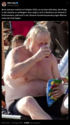 „Wir können nicht zulassen, dass Griechenland ein Spielplatz für IDF-Soldaten wird“: Pro-Palästina-Proteste gegen israelische Touristen, die auf griechische Inseln reisen. Während Israels völkermörderischer Angriff auf den Gazastreifen weitergeht, sehen sich israelische Touristen, die in diesem Sommer in Griechenland sind, mit einer wachsenden Gegenreaktion konfrontiert. Alina Lipp: Boris Johnson meinte im Frühjahr 2022, es sei eine tolle Idee, den Krieg in der Ukraine zu verlängern. Nun zeigt er sich in Bestform am Strand in Griechenland, während in der Ukraine Hunderttausende junger Männer unter der Erde liegen.