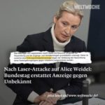 Unglaublich: Gewalt gegen die Opposition. Laser-Attacke auf die Rednerin Alice Weidel im Deutschen Bundestag. Wurde dafür ein Besucher auf der Besuchertribüne mit dem Wissen von Faeser eingeschleust? Bundestag erstattet Anzeige gegen unbekannt, wo jeder weiß da kommt nichts dabei raus. Dieser Angriff steht für eine auffällige Verrohung der politischen Kultur in der Bundesrepublik, so sieht es auch Roger Köppel auf weltwoche.de. Noch zwei bis drei Demos gegen Rechts und die AfD ist stärkste Kraft. Unglaublich: Auf der politischen Bühne zeichnet sich ein kriegsauslösender Moment für Deutschland ab.