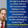 Doch Hans-Georg Maaßen lässt nicht locker: Der Chef des Verfassungsschutzes bekräftigte erneut seine Sorge, dass jenes ominöse Video, welches in 19 Sekunden Länge eine angebliche Hetzjagd auf Ausländer in Chemnitz zeigen soll, gezielt als Teil einer Desinformationskampagne eingesetzt wurde, um politisch abzulenken: Maaßen verteidigt Zweifel an Authentizität von »Hetzjagd«-Video. Hetzjagd in Deutschland, siehe auch die CDU-Grüne Amri Stadt Ravensburg.