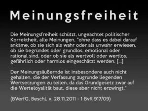 Suchmaschinenkürzungen, Zensur, Bücher auf dem Index, Information`s Sperrungen und das Ende der Meinungsfreiheit: 900 Bücher kamen auf den Index, 6000 YouTube Videos wurden gesperrt, Wahrheiten dürfen in unserem Land nicht gesehen werden, weil Wahrheit ist in Deutschland ein Straftatbestand, siehe Ravensburg. Unsere Bürgerrechte werden durch die „präventiv-polizeiliche“ Datenspeicherung nahezu abgeschafft. Dabei sollen sie uns vor einem zu mächtigen Staatsapparat schützen. Denn Macht neigt dazu, missbraucht zu werden. Andere Staaten zeigen, wie schnell die angstfreie Meinungsäußerung und damit die Demokratie beeinträchtigt werden kann. Die demokratische Freiheit zu verteidigen liegt in der Verantwortung von allen. Deshalb fordern wir „Freiheit statt Angst“.