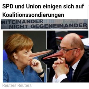 Deutschland hat wieder eine Regierung, die vierte und die schlimmste unter Kanzlerin Merkel. Merkels neue Gurkentruppe, die Chaostruppe. Nach der Jamaika-Sondierungen übernimmt wieder die SPD, die eine GroKo nach der Wahl noch ausgeschlossen hatte, doch wieder Regierungsverantwortung. Wir in der RRRedaktion hatten das bereits aus vertraulichen Quellen gleich nach der Wahl erfahren, was man tatsächlich vorhatte, wie die Wähler und Parteimitglieder reingelegt werden sollen. Lügen habe auch im Bundestag kurze Beine, die Wahrheit kommt irgendwann immer ans Tageslicht. Es steht fest das nichts feststeht! Koalitionsvertrag_CDU_CSU_SPD 2018