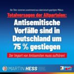 Martin Hess: Deutschland ist inzwischen das gefährlichste Land für Juden, gemessen an der Größe der jüdischen Gemeinde. Die antisemitischen Vorfälle stiegen hierzulande zwischen 2021 und 2023 um 75 Prozent. Für 2024 wird ein neuer Höchststand erwartet. Die Täter rekrutieren sich zunehmend aus islamistisch geprägten Milieus – angeheizt durch den Terrorangriff der Hamas auf Israel. Es ist offensichtlich: Der explodierende Antisemitismus auf deutschem Boden ist auch eine direkte Folge der gescheiterten Migrationspolitik der Altparteien. Diese haben jahrelang Millionen Menschen ins Land geholt, darunter zu viele mit einem tief verwurzelten Hass auf Juden. Gleichzeitig rufen Hamas-nahe Gruppen zum globalen Dschihad auf – zum blutigen Kampf gegen „Ungläubige“, insbesondere gegen Juden. Islamische Autoritäten erklären diesen Aufruf zur „Pflicht für jeden einzelnen Muslim“. Kein Wort der Distanzierung von DITIB, kein Aufschrei vom Zentralrat der Muslime. Dieses Schweigen spricht Bände. Nur die AfD spricht diese inakzeptablen Zustände klar an. Wir fordern: Schluss mit der Massenzuwanderung, konsequente Abschiebung islamistischer Gefährder und ein unmissverständliches Bekenntnis zur Sicherheit jüdischen Lebens in Deutschland. Wer Antisemiten ins Land holt, macht sich mitschuldig. Nur wir stehen für ein Deutschland, in dem unsere jüdischen Mitbürger wieder ohne Angst leben können.