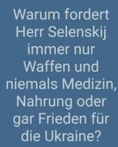 Massenmörder Selenskyj: Ich bin auf den Beitrag eines Bundestagsabgeordneten Herrn Mesarosch (SPD) gestoßen und war über sein Beitrag geschockt. Folgende Sätze stehen auf seinem Foto im Großformat: „Putin hat heute Raketen in ein Kinderkrankenhaus in Kiew geschossen. Warum wir der Ukraine Flugabwehrraketen liefern? Deswegen.“ Es ist immer ganz schlimm, wenn Menschen sterben, vor allem Kinder. Wann hört aber diese Kriegs-Propaganda endlich auf? Wie oft hat ukrainische Seite in Vergangenheit etwas behauptet, was sich später als Lüge entpuppt hat? Wie oft wurde versucht Kriegsverbrechen zu vertuschen? Unglaublich… dass Menschen immer noch auf diese Kriegspropaganda drauffallen. Im Video (Zusammenschnitt aus 9 Netzfunden) zeigen die Augenzeugen, von wo Raketen abgefeuert wurden und wie diese ausgeschaut haben. Obwohl es strengstens verboten ist Aktivitäten von ukrainischen Streitkräften zu filmen, haben Bürger offensichtlich aufgehört Angst davor zu haben. Die Rakete, die das Krankenhaus (Abteilung der Toxikologie!) traf, wurde als „NATO“-Rakete identifiziert (im 7-ten Video wird darüber berichtet): PWO AIM 120 ZRK NASAMS (Schreibweise unbekannt). Einige Blogger zeigten in ihren Videos Schrapnellen, die ebenfalls zu dieser Raketenart gehören (Screenshot des Fotos siehe Kommentare). Das russische Verteidigungsministerium gab gestern eine Erklärung zum gestrigen Angriff auf das Militär ab: „Als Reaktion auf Versuche des Kiewer Regimes, den russischen Energie- und Wirtschaftsanlagen Schaden zuzufügen, haben die russischen Streitkräfte heute morgen einen Gruppenangriff mit Präzisionswaffen mit großer Reichweite auf Einrichtungen der ukrainischen Militärindustrie und ukrainischen Luftfahrtstützpunkte (WSU) gestartet. Die Aussage von Vertretern des Kiewer Regimes über einen angeblich absichtlichen Raketenangriff Russlands auf zivile Ziele ist absolut unwahr (entspricht nicht der Tatsache). Das Ziel solcher Provokationen besteht darin, die weitere Finanzierung des Kiewer Regimes und die Fortsetzung des Krieges bis zum letzten Ukrainer sicherzustellen.“ Im 7-ten Video der Videoreihe, nach dem der Blogger die Raketenart genannt hat, appelliert er an die Ukrainer und wiederholt mehrmals die erste Frage: „Ukrainer, warum tötet ihr eigene Kinder? Warum schießt ihr auf euch (eure Bevölkerung) selbst?“ Zum Thema „Krankenhaus, Abteilung der Toxilogie“ bin ich auf ein paar Videos (2 letzte Videos) mit solchen Informationen gestoßen, die sehr viele Fragen aufwerfen. Übersetzung des vorletzten Videos: „Und hier ist eine Fortsetzung eines solch gefährlichen Themas in der Toxikologie: Der Chef der russischen RHBZ-Truppen gab heute bekannt, dass im Gebiet Avdeevka ein chemisches Labor der ukrainischen Streitkräfte (WSU) entdeckt wurde, in dem Proben von Natriumcyanid, Schwefelsäure und anderen tödlichen Chemikalien gefunden wurden.“ Weiterlesen.