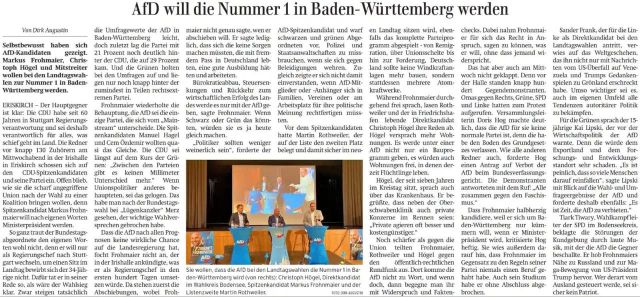 Fakten, Auszüge aus den Reden: Es geht ein Ruck durch die Gesellschaft, wir lassen nicht locker für die Landtagswahl, die blaue Welle rollt durchs Land, 2026 schreiben wir Geschichte. In den Umfragen stehen wir bei 26 bis 27 Prozent. Die Freude über das neue Jahr ging ziemlich schnell vorbei als man die Neujahrsansprache des Bundeskanzler hörte. Alles wird teurer, CO2 Steuer, Tanken, Krankenversicherung und man fragt sich, warum wird denn alles teurer? Ja, wir werden älter, die Behandlungskosten steigen, dass ist ein Teil der Geschichte, aber der andere Teil der Wahrheit ist, dass die Regierungen Millionen der Bürgergeldempfänger davon über 50% nicht deutsche Staatsbürger und Asylbewerber in die versicherten Gemeinschaft geschoben haben und nur die Hälfte der Kosten übernehmen. Das ist juristisch betrachtet ein rechtwidriger Eingriff in die Selbständigkeit der Sozialversicherungsträger und ein Verstoß gegen die Zweckbindung. Es wurden über 10 Milliarden Euro zweckentfremdet, dass ist unehrlich, unsozial und unmoralisch. Wer Menschen und Versicherungsnehmer gegeneinander ausgespielt der gehört abgestraft und hat in einer Regierungsverantwortung nichts zu suchen. Der Lügen-Kanzler fordert das man sich weniger krank meldet und die Krankenkassen bringen eine Kontaktgebühr ins Spiel. Wie krank ist denn sowas? Millionen brav schaffende Bürger werden unter Generalverdacht gestellt, sie wären zu faul und würden sich zu oft krank melden. Vor kurzem hieß es noch von der CDU, „niemand wird etwas weggenommen“. Abwählen und sie nicht wieder an den Schalthebel der Macht kommen lassen. Wir haben die niedrigsten Renten in Europa, immer mehr Rentner gehen zum Flaschen sammeln, nur damit die CDU-CSU Milliarden an die Ukraine verschenken können, damit sich die korrupten Minister von Selenskyj goldene Toiletten leisten können. 33 Milliarden gehen an Entwicklungshilfe ins Ausland, für LED Lampen in marokkanische Museen und zig Million an an die Taliban. Wir werden das alles abschaffen und ihnen das Handwerk legen, eine Umschichtung dieser Gelder, zu Gunsten der Bevölkerung. Jedes 3. Unternehmen macht dieses Jahr Stellenabbau, alles was Rang und Namen hat, 33% der Unternehmen wollen weniger investieren. Private Investitionen sind auf dem Niveau von 2015, wir haben seit 11 Jahre einen Stillstand. Auslandsinvestoren machen einen Bogen um Deutschland. Der Staatskonsum ist seit 2015 um 25% gestiegen, dass Bruttoinlandsprodukt stagniert seit 2018. Wer stellte in BaWü die Wirtschaftsminister? Die CDU! Die Schuld haben aber andere, Putin, auch Trump wird beschimpft, Corona, manchmal ist das Klima schuld, oder gar die Affenpocken. Die Unternehmen packen die Koffer aus Verzweiflung, verlagern die Arbeitsplätze, wegen der Bürokratie, Steuern und Energie. Deutschland hat die teuersten Energiepreise der OSCE Länder, die weltdümmste Energiepolitik, die Infrastruktur zerfällt, die Züge sind unpünktlich, Krankenhäuser müssen schließen, die Landesregierung weiß nicht einmal ob sie 1400 Lehrer mehr oder weniger eingestellt haben, sie haben völlig den Überblick verloren. Aber das Weltklima wollen sie retten und das Klima auf 1,5 Grad fixieren. Die Kernkraft sagt sogar die EU ist Klimafreundlich, wir sagen sie ist günstig, sicher und grundlastfähig. Bei der letzten Klimakonferenz haben 20 Länder, darunter 11 EU Länder ein Abkommen unterzeichnet, die den Ausbau der Kernenergie verdreifachen soll, nur Deutschland ist und bleibt der Geisterfahrer, mit der AfD wird es keine Windkraft-Monster-Anlagen in BaWü geben, es ist ein ökonomischer und ökologischer Schwachsinn. Eine AfD Regierung will einen vernünftigen Energie-Mix liefern, Bürger und Unternehmer damit entlasten und dafür sorgen, dass wir international wieder konkurrenzfähig sind. Deutschland hat auch die höchste Steuerlast, dass ist kein familienfreundliches Land, Lohnsteuer, Einkommenssteuer, Sozialabgaben machen Arbeit auch teurer, die CO2 Steuer ist eine Steuer auf das Leben. Steuern sind eine Kriegserklärung gegen die Unternehmer und Arbeitnehmer. Die AfD wird diesen Kriegen gegen die Unternehmer und gegen die Bürger beenden. Nur ein schlanker Staat ist ein starker Staat, der seine Kernaufgaben im Griff hat. Die größte Wahlkampflüge der Geschichte belastet uns mit einer Zinslast von 62 Milliarden Euro pro Jahr, mit 10% des Bundeshaushaltes, also ein Drittel, nur noch 3% des Bundeshaushaltes sind im Bundestag verhandelbar, die anderen 97% sind schon verfrühstückt. Deutschland ist international zum Negativ-Beispiel und zur Lachnummer verkommen. Was der Kanzler kann Hagel auch? Die Gesamtverschuldung Deutschlands beziffert Prof. Raffelhüschen auf 20 Billionen Euro. Es muss was vor der Wahl gesagt wird, auch nach der Wahl Gültigkeit haben, dafür sorgt die AfD, es ist eine Frage der Gerechtigkeit und des sozialen Friedens, keine Schönwetter Floskel, keine Schaufensterreden. Ja wir brauchen auch die 4. Gewalt, die Presse, freie Medien-Anstalten, die Grundlage ist Information, keine Wertung, keine Einordnung, keine Ausblendung, kein moralisieren, kein Vordenken, keine Gehirnwäsche. Keine Talkshows mit links-grünen Klatschhasen, in Position gesetzt, um die politischen Gegner zu diskreditieren. Der öffentlich rechtliche Rundfunk ist zum Regierungsfunk verkommen, mit über 10 Milliarden Euro GEZ-Zwangsabgaben, der teuerste öffentliche Rundfunk der Welt. Schweigegeld oder Stillhalteprämie? Gehältern das einem schwindelig wird, Tom Buhrow mit 427.000, Kai Kniffke, mit 392.000 Euro Jahresgehalt. Betriebsrenten über 15.000 Euro im Monat, sie heben sich den öffentlichen Rundfunk zur Beute gemacht, er ist zum Selbstbedienungsladen geworden, die AfD wird diesen Laden schließen und ersetzen, für einen schlanken, vernünftigen Rundfunk, denn wir können selber denken. 84% der DEUTSCHEN wollen die Abschaffung der GEZ-Zwangsgebühren.
