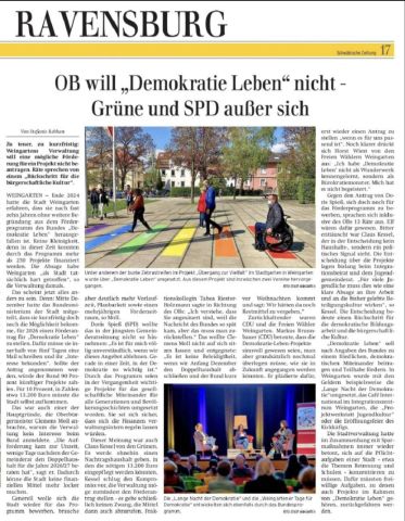 Es darf gerne mal recherchiert werden: (Zeitzeuge M.) Mit welchen Summen solche Veranstaltungen wie heute in Ravensburg finanziert werden. „Demokratie Leben“ – eine staatliche NGO zur Meinungsbildung! Die Sponsorenliste für Ravensburg ist lang, aber nicht von besonderer Bedeutung, viele lassen sich einfangen, von der moralisch „besseren Seite“ Mehrere Tausend Euro Steuergeld sind für die Demo „Laut gegen Rääächts“ versenkt worden, um Flyer und Plakate zu drucken. Ebenso darf gerne mal hinterfragt werden, welche Interessen die Stiftung Liebenau verfolgt, ob die Asylindustrie aus Nächstenliebe gefördert wird, oder ob es nicht darum geht, so viele Immobilien wie möglich an „Geflüchtete“ zu vermieten. Weshalb es so wichtig ist, gegen Kritiker auf die Straße zu gehen. Der Oberbürgermeister Moll hat es richtig gemacht, sich davon zu distanzieren. Zu gerne würde ich mit ihm ein Interview machen, damit diese Vereinigung detaillierter interfragt wird. Bildquelle, Volksmund: Schäbige Zeitung vom 26.1.2026.