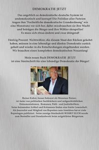 Sagt endlich NEIN zur parlamentarischen Demokratie! Sagt endlich NEIN zur Diktatur der Parteien! Sagt endlich NEIN zur weisungsgebundenen Justiz! Sagt endlich NEIN zum Freihandelsabkommen mit den USA! Sagt endlich NEIN zur NATO! Sagt endlich NEIN zu deutschen Waffenexporten! Sagt endlich NEIN zur Stationierung amerikanischer Truppen auf deutschem Boden! Sagt endlich NEIN zu mörderischen Drohnen, die von deutschem Boden abgefeuert werden! Sagt endlich NEIN zu Bundeswehreinsätzen im Ausland! Sagt endlich NEIN zu Pegida! Sagt endlich NEIN zur einseitigen Israel – Politik! Sagt endlich NEIN zur Kriegshetze! Bürger von Deutschland: WEHRT EUCH! ERHEBT EUCH! ENGAGIERT EUCH! Ungehorsam ist die erste Bürgerpflicht, wenn der Staat den Boden des Rechts verlässt! Habt Mut! Seid solidarisch! Zeigt den Lobbyisten, den Medienzaren und den Politikern, wem das Land gehört! Nämlich EUCH und niemand sonst! Wir wollen eine Demokratie der Bürger und kein Feudalsystem der Lobbyisten und deren Marionetten! (Rainer Kahni dit Monsieur Rainer, Journalist und Buchautor, Mitglied von Reporters sans frontières)
