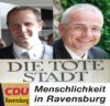 Nach der SPD ist jetzt die CDU an der Reihe: Machterhalt, Seilschaften, Netzwerke, Vetternwirtschaft. Sie wollen beide ihren Abstieg nicht wahrnehmen und feiern ihre Niederlagen wie ein Sieg. Am Untergang der CDU ist die Ravensburger Rapp, Engler, Schuler, Müller CDU nicht unbeteiligt, deshalb glaube niemals einer Grünen-CDU in Ravensburg! Erst fragen sie dich aus, dann legen sie dich rein und gehen dann gegen dich vor, sie benutzen, missbrauchen die Einwohner für ihre niedrigen Ziele! Wie lächerlich zeigt sich Ravensburg noch? Die Welt lacht über uns. Das Kasperle-Theater, der Komödienstadl „Escher-Steg“ zeigt uns wieder einmal, wie die Bürgerschaft angelogen und wie sie von der CDU politisch manipuliert werden. Die Schwäbische Zeitung und der Südfinder bilden ihnen dann ihre Meinung. Oberstleutnant und Gastronom Schuler, MdL, Richter am Landgericht, Axel Müller, MdB und Rolf Engler, Gemeinderat, sie zeigen Ihnen wie das mit der Unwahrheit geht. Der Grüne Lobby-Minister Lucha hat darin bereits Erfahrung, siehe auch weiter unten und im Teil 1-5.