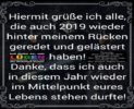 Auch Man in Black kann es nicht sein lassen. Jetzt kommt noch der Höhengang dazu, Alkohol vernebelt das Hirn, es wird gelogen, Falschbeschuldigt, dass sich die Balken biegen. Er hängt, das an ihn persönlich gerichtete Schreiben, an die Haus- und Garagentüre und an die Gartentüre bei G`s mit dazu. Datenschutzverletzung, üble Nachrede, Verleumdungen, Rufmord, Falschbeschuldigungen wurde jetzt zur gemeinsamen Sache, ein dreier Komplott hat sich gebildet. Die Privat-Haftungs-Rechnungen, die Schadensersatzforderung sind bei allen angekommen, man konnte es am 7.1.20, um 17.35h, auf dem Friedhofs-Weg nicht überhören, nicht übersehen.