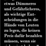 In den Interviews mit den Grünen merkt man: Kein Plan, viel Ideologie und noch mehr dumme Arroganz. Mit CDU und SPDlern merkt man das die Arroganz der Dummheit und Raffgier Hirn frisst. Die FDP hat ihren Anschluss verpasst, sie steht nicht hinter der Mittelständigen Wirtschaft und die CDU-CSU-Grünen-Linken sind am schlimmsten, SED-Diktatur nein Danke.