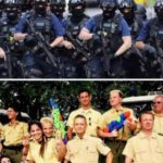Das sind ihre neuen Freunde heute: Die Polizei fungiert jetzt offiziell als verlängerter Arm der faschistisch anmutenden Gesetze. Dein Freund und Helfer, Bürger in Uniform war gestern.