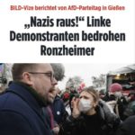Antifa-Schläger greifen Mitarbeiter des konservativen Magazins „Tichys Einblick“ an! 6.000 Beamte im Einsatz: Linksextremisten belagern Gießen/AfD-Bundestagsabgeordneter attackiert. In Gießen eskalieren die Proteste gegen die Gründung einer AfD-Jugendorganisation. Die Polizei verliert die Kontrolle. Weiterlesen.