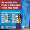 Martin Hess: Mit allen Mitteln wird derzeit versucht, unsere demokratisch legitimierte Partei zu diskreditieren. Jüngst geriet unsere Parteisprecherin Dr. Alice Weidel persönlich in den Fokus der „Süddeutschen Zeitung“. Die Tageszeitung behauptete, Weidels Doktorarbeit sei „in weiten Teilen“ abgeschrieben. Doch nun erlebte die SZ eine schwere Niederlage: Die Universität Bayreuth bestätigte, dass Alice Weidel wissenschaftlich korrekt gearbeitet hat. Die Plagiatsvorwürfe der SZ-Journalisten waren völlig haltlos. Aber schauen wir zurück auf die Altparteien-Politiker, deren fehlerhaftes Verhalten zur Aberkennung des Doktortitels geführt hat: