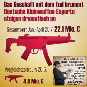 RRRedaktion: Deutschland ist einer der größten Hersteller und Exporteur von Kleinwaffen und Munition. Sie werden in Krisengebieten rund um den Globus verkauft. Die nächste Bundesregierung muss endlich handeln und gesetzliche Verbote gegen das Geschäft mit dem Tod einführen. Volker Kauder, CDU, schützt und fördert gerne seine Waffenfirma und stattet damit die Bundeswehr/NATO aus.