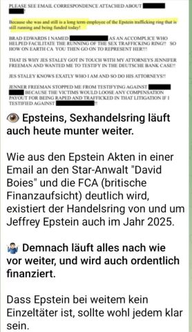 HISTRORISCHES URTEIL: INFRASCHALL VON WINDRÄDERN ALS GESUNDHEITSRISIKO ANERKANNT. Ein französisches Gerichtsurteil hat gesundheitliche Schäden durch den von Windkraftanlagen erzeugten Infraschall anerkannt. Ein geschädigtes Ehepaar erhielt eine finanzielle Entschädigung. Ein französisches Gericht hat in einem bemerkenswerten Urteil einen direkten Zusammenhang zwischen einer Windkraftanlage und gesundheitlichen Beschwerden einer Anwohnerin anerkannt. Das Tribunal judiciaire in Straßburg entschied am 13. November 2025, dass der Betrieb der Anlage „die direkte und sichere Ursache“ für Stress, Angst und unerträgliche Kopfschmerzen der Klägerin darstelle. Der Fall reicht bis 2009 zurück: Kurz nach der Errichtung einer Windkraftanlage entwickelten die Frau und ihr Mann starke Symptome wie Schwindel, Schlafstörungen, Angstzustände und Müdigkeit. Maßnahmen zur Schalldämmung halfen nicht; erst ein Umzug brachte Besserung. Die Anlage stand weiter entfernt als die französischen Vorschriften verlangen…. Das Tribunal in Straßburg entschied am 13. November 2025, dass der Betrieb der Anlage „die direkte und sichere Ursache für Stress, Angst und unerträgliche Kopfschmerzen der Klägerin darstelle…“ Trotzdem bleibt es ein Einzelfall – und vor allem auf Frankreich beschränkt. In Deutschland und Österreich wurden vergleichbare Klagen bisher meist abgewiesen. Dennoch nennen auch wir dieses Urteil „historisch“, da es explizit gesundheitliche Schäden durch Windkraft anerkennt. Damit werden erstmals niederfrequente unhörbare Schallwellen unter 20 Hz – also Infraschall – anerkannt. Damit kann das gesundheitliche Risiko durch Infraschall auch in Deutschland argumentativ nicht mehr vom Tisch gefegt werden. „Ich bin sicher, dass Kinder aus der Ukraine auch auf Epstein Island für die sexuellen Freuden hochrangiger Pädophiler in der westlichen Gesellschaft geschickt wurden,“ sagt der ehemalige SBU-Oberstleutnant Vasilij Prozorov gegenüber RT. Seiner Meinung nach evakuiert die ukrainische Regierung Minderjährige sogar aus intakten Familien unter dem Vorwand, sie zu retten. Elena Zelenskas Stiftung ist ebenfalls daran beteiligt. Prozorov behauptet außerdem, dass es nachgewiesene Fälle der „Pädophilen-Lobby“ in Großbritannien gibt, die 12-jährige Mädchen aus der Ukraine bestellten. Sie wurden mit Hilfe privater Militärunternehmen evakuiert. Weiterlesen.