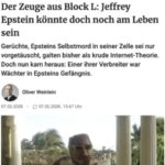 Epstein: Neue Dokumente des Justizministeriums lassen vermuten, dass Jeffrey Epstein möglicherweise noch am Leben ist und in der Nacht, in der er angeblich „sich das Leben nahm“, aus seiner Gefängniszelle gebracht worden sein könnte. Überwachungsaufnahmen aus der Nacht von Epsteins Tod zeigen eine orangefarbene Gestalt, die sich in Richtung des verschlossenen Trakts bewegt, in dem sich seine Zelle befand, was im Widerspruch zur offiziellen Darstellung steht. „Ein orangefarbener Gestalt scheint die Treppe zum L-Stockwerk hinaufzulaufen, möglicherweise handelt es sich um einen Insassen, der zu diesem Stockwerk begleitet wird.” In einem FBI-Protokoll wurde das unklare Bild später als „möglicherweise ein Insasse” beschrieben. Weiterlesen.