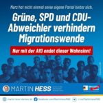 Martin Hess: Der Gesetzentwurf der Union zur Begrenzung der Migration wurde am 31.1.25 abgelehnt. 338 Abgeordnete stimmten dafür, darunter selbstverständlich auch unsere AfD, 350 dagegen, es gab 5 Enthaltungen. Diese Abstimmung zeigt erneut, dass eine echte Wende in der Migrationspolitik mit der CDU nicht zu machen ist. Friedrich Merz mag sich als Kritiker der aktuellen Asylpolitik inszenieren, doch in seiner eigenen Partei gibt es Abweichler, die den migrationsfreundlichen Kurs der Altparteien weiter mittragen. Noch absurder: Nach der Wahl will Merz mit genau den Parteien koalieren, die heute jede Verschärfung der Migrationspolitik blockiert haben – also mit SPD und den Grünen. Das ist keine glaubwürdige Politik, sondern Täuschung der Wähler! Wer wirklich eine konsequente Begrenzung der Migration will, kann sich nicht auf die leeren Versprechen der Union verlassen. Nur mit der AfD gibt es eine echte Wende und eine Politik, die sich endlich an den Interessen der Bürger orientiert.