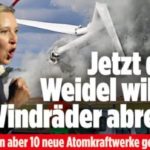 Die AFD hat Themen, mit denen man Wahlen gewinnt!: Jetzt stellte Weidel im hessischen Neu-Isenburg klar, dass sie alle Windräder meint: „Wir werden die hässlichen Dinger niederreißen. Wir werden sie niederreißen, wo sie nicht hingehören und wieder aufforsten.“ Weidel verspricht, dass sie als Kanzlerin „sofort ein Moratorium einführen wird, den sofortigen Stopp von Windkraftwerken“. Viele Hessen ärgert’s, dass es kaum noch Flecken gebe, die nicht weit sichtbar „zugespargelt“ seien. Es regt sich Widerstand: Erst vor ein paar Tagen haben sich der Frankfurter Eintracht-Präsident Mathias Beck (53) und Henning Strauss (53) vom weltweit bekannten Arbeiter-Bekleidungshersteller Engelbert öffentlich gegen Windräder positioniert. Denn in Hessen soll ein zweiter berühmter Märchenwald den Windrädern zum Opfer fallen: der Spessart bei Bad Orb. In bundesweit ganzseitigen Anzeigen heißt es: „Schützenswerter Spessart in Gefahr! Die Bürger bleiben kämpferisch: Unser Wald bleibt, wir lassen uns nicht einschüchtern.“