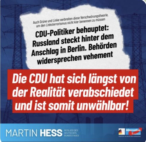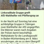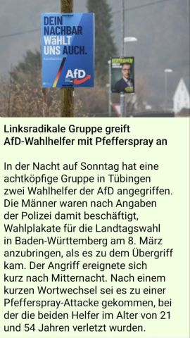 Wir leben doch im BESTEN Deutschland aller Zeiten: AfD Wahlhelfer wurden von eine 8-köpfigen Gruppe beim Plakataufhängen attackiert und mit Pfefferspray besprüht. In welchem Land leben wir mittlerweile? Wo man wie im 3. Reich, kauft nicht bei Juden und heute heute heißt es, kauft nicht bei Russen, nicht bei AfDlern, sind wir schon im 4. Reich oder im DDR 2.0? Die politisch engagierten Schlägertruppen sind unterwegs, so wie damals die SA? Das ist purer TERROR und gelebter Faschismus im Deckmantel unserer Demokratie. Die Altparteien, die Justiz und die Polizei sind begeistert? Es reicht!