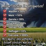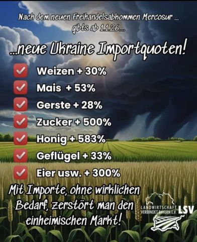 Für einen Massenmörder Selenskyj: Vernichten wir unseren einheimischen Markt. Nach dem neuen Freihandelsabkommen Mercosur gibt es ab 1.1.26 neue Ukraine Importquoten! Mit Importe, ohne wirklichen Bedarf, will man den heimischen Markt zerstören. Wir kaufen jetzt GEN-manipulierte Produkte aus der Ukraine: Weizen + 30%, Mais + 53%, Gerste + 28%, Zucker + 500%, Honig + 583%, Geflügel + 33%, Eier + 300%. Na dann guten Appetit, herzlichen Glückwunsch und gute Besserung. Die Altparteien und das Söder-Land freuen sich.