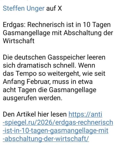 Warum die USA bis heute Iran noch nicht angegriffen haben?: Seit Anfang Januar verstärken die USA ihre Präsenz im Persischen Golf. Der Flugzeugträger Abraham Lincoln (der größte der USA) ist dorthin geschickt worden. Es scheinen zu Zügen gemacht, zu viele Aktivitäten durchgeführt worden zu sein, als das es sich hier nur um „Säbelrasseln“ handeln würde. Außerdem hat Trump mit seiner großspurigen Art verkündet, dass Hilfe für die Demonstranten (oder doch gewalttätigen Mopp) unterwegs sein… Aber irgendetwas scheint schief zu laufen… Ein paar Dinge, welche damit zu tun haben könnten… China und Russland haben Kriegsschiffe in den Persischen Golf geschickt und führen dort „gemeinsame Manöver durch“. Das gesamte Internet, worüber die Proteste (von außen?) koordiniert wurden, ist in Iran „ausgefallen“. Darunter auch die angeblich im Land aktiven 20.000 StarLink Terminals. Experten meinen, dies wäre nur mit Hilfe der neuesten russischen elektronischen Kampfmittel möglich. Trumps Rettung „kommt zu spät“. Die Unruhen sind niedergeschlagen. Die These: Es scheint fast so zu sein, als würden es China und Russland diesmal, im Gegensatz zu Venezuela, nicht zulassen, dass die Amerikaner einen gewaltsamen Change in Iran veranstalten. China bezieht einen erheblichen Anteil deines Erdöls aus Iran und Russland sieht in Iran seinen strategischen Verbündeten in der Region. Und im Gegensatz zu Venezuela ist Iran militärisch „in Reichweite“ der Russen und Chinesen. Die Amerikaner haben aber im Gegenzug nur begrenzte Ressourcen und eine problematische Logistik. So hat die USA im Falle eines „größeren Konfliktes“ schlechte Karten. Diese These wurde auch die Selbstsicherheit erklärten, mit der die Iraner bei den Verhandlungen auftreten… Aber warten wir ab.